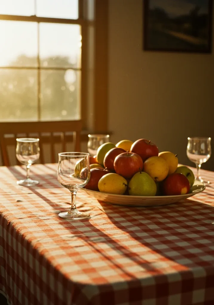 A red-and-white gingham cloth covers the table with a simple centerpiece of apples and pears piled high on a platter. The golden evening sunlight pours through the window, making the scene feel warm and nostalgic.