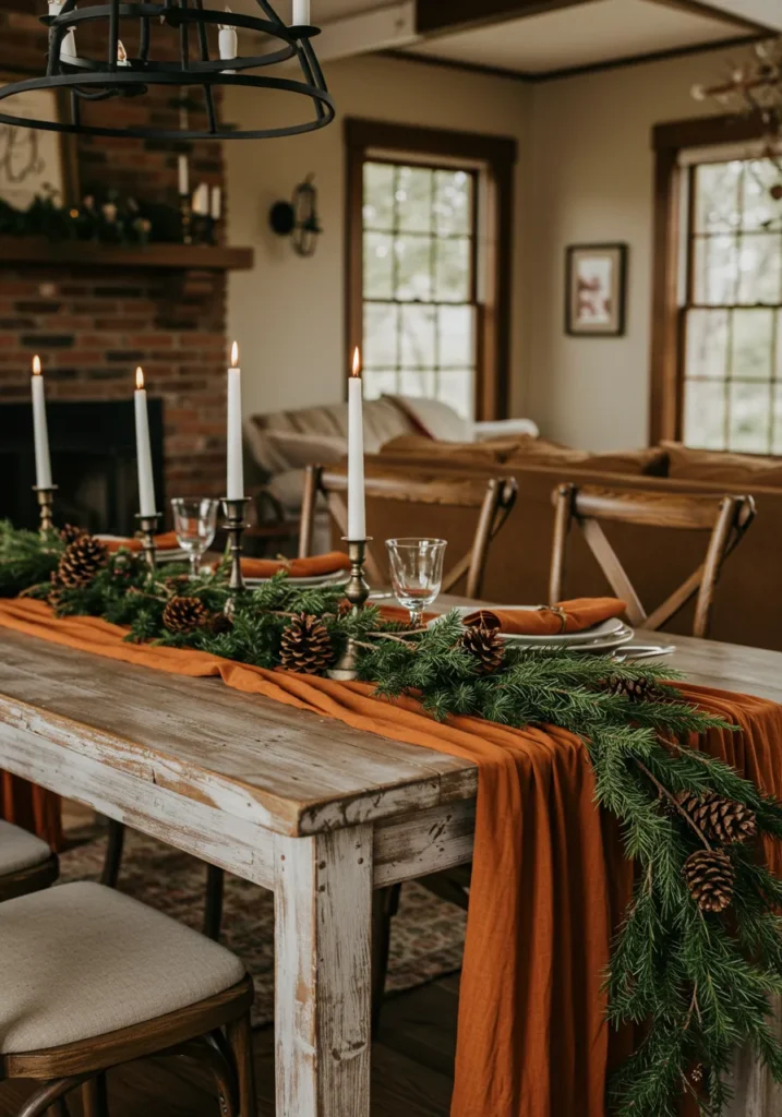 A distressed farmhouse table is dressed with a flowing burnt orange runner and fresh evergreen garland dotted with pinecones. Tall candlesticks add height, creating a look that feels both cozy and dramatic.
