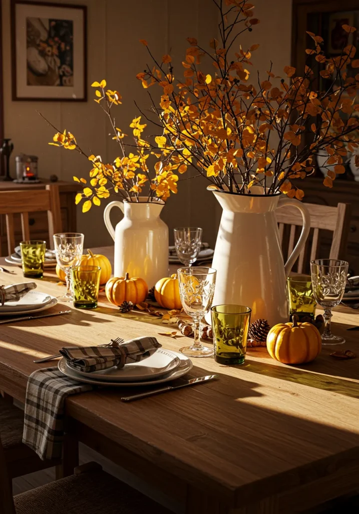 This table shines with tall white pitchers filled with branches of golden autumn leaves. Small pumpkins and pinecones are scattered across the runner, while green goblets bring a fresh pop of color to the setting.