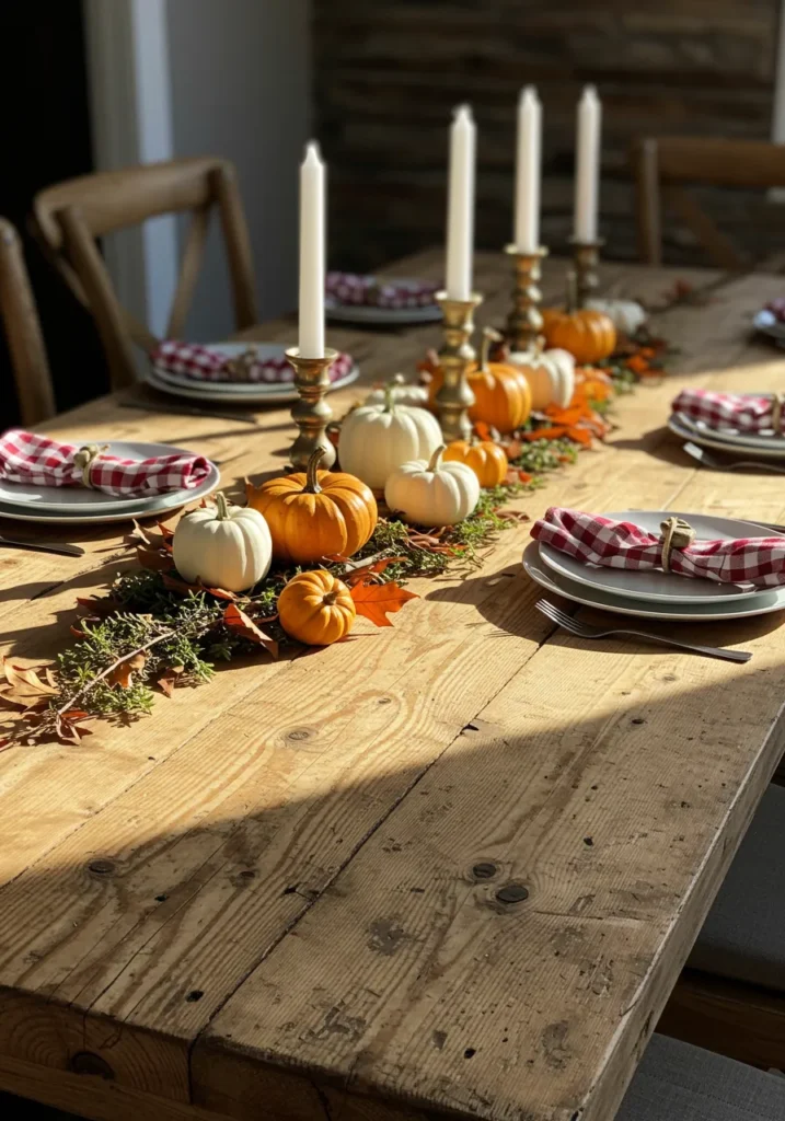 I think this one feels so inviting because of its simplicity. The plaid brings that classic fall vibe, and the pumpkins add just enough seasonal flair to make the table feel festive without going over the top.