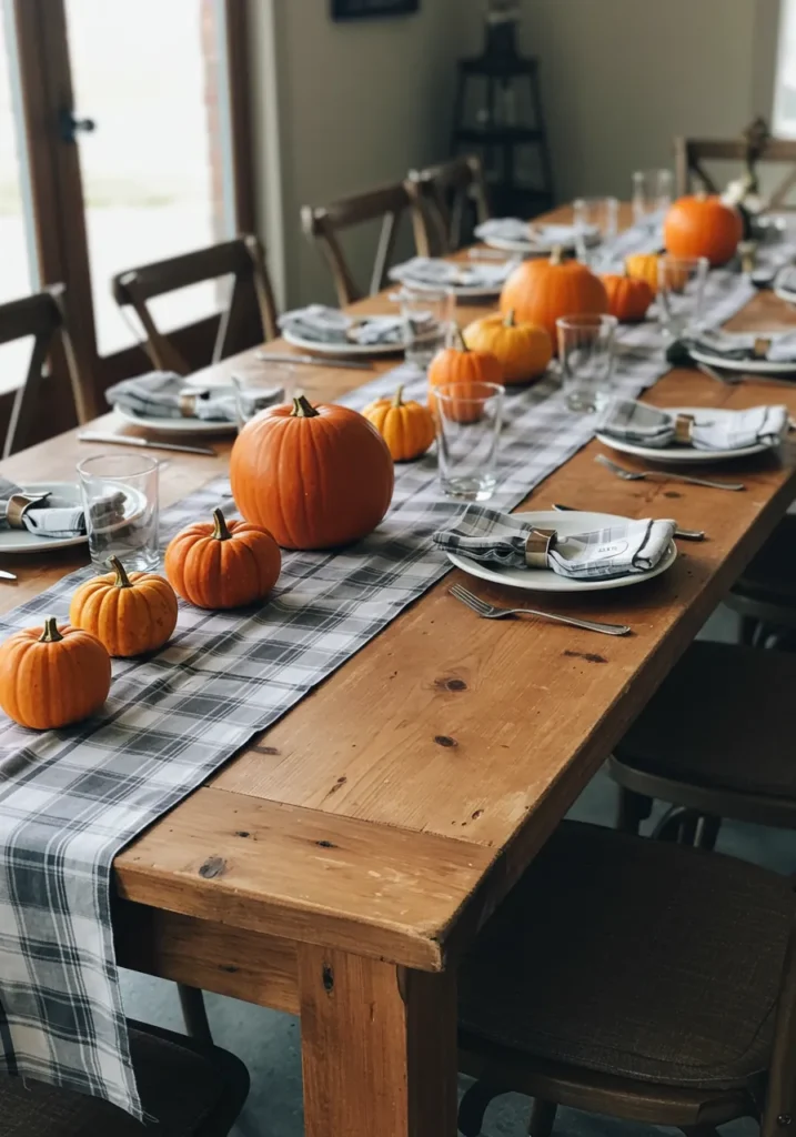 Rustic wood meets playful harvest charm with a plaid table runner topped with pumpkins in all different sizes. Neutral napkins folded neatly at each place setting keep the look grounded and balanced.