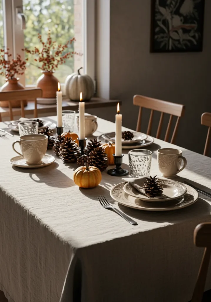 A cream tablecloth sets the backdrop for a cozy arrangement of pinecones, mini pumpkins, and taper candles in simple holders. Paired with neutral plates and mugs, the look leans earthy and welcoming.