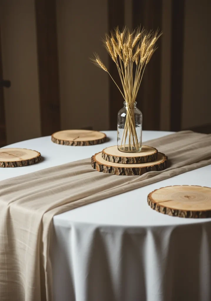 A round table is styled with a soft neutral runner, white tablecloth, and rustic wood slices doubling as chargers. A simple glass vase with dried wheat sits at the center, tying it all together with farmhouse flair.