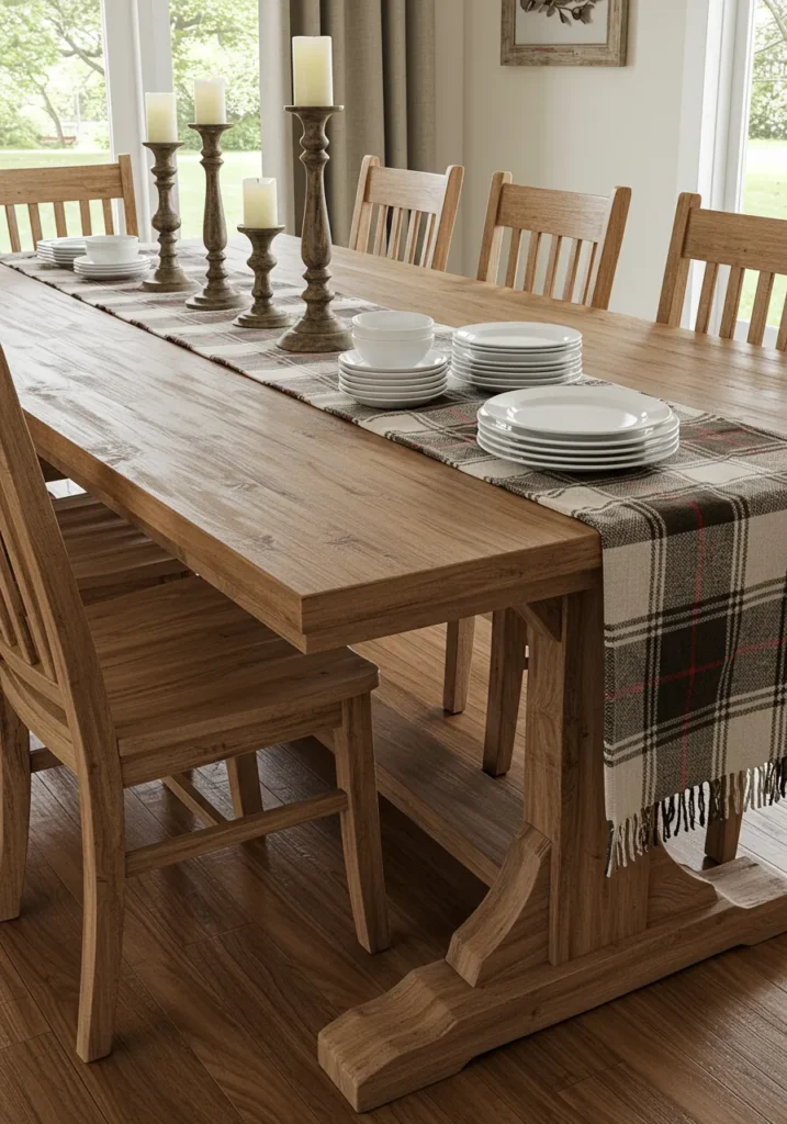 This tablescape brings rustic charm with a long wooden table layered in a plaid runner and stacked white plates ready for serving. Tall candle holders with glowing ivory candles create a warm and welcoming centerpiece that feels timeless yet inviting.