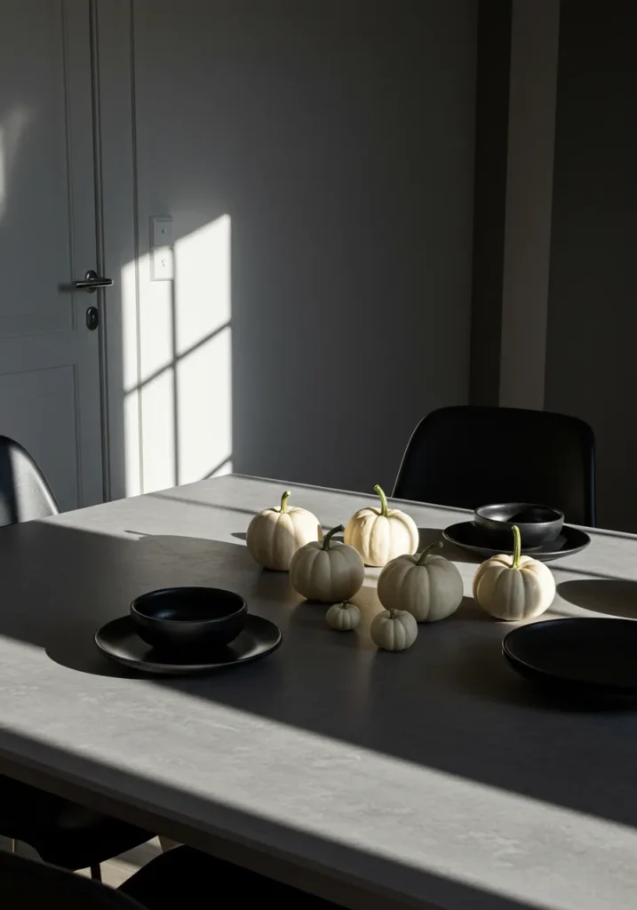 A sleek gray table is decorated with matte black plates and bowls, paired with clusters of small white pumpkins. The sharp light and shadows from the window give the minimalist look a dramatic edge.