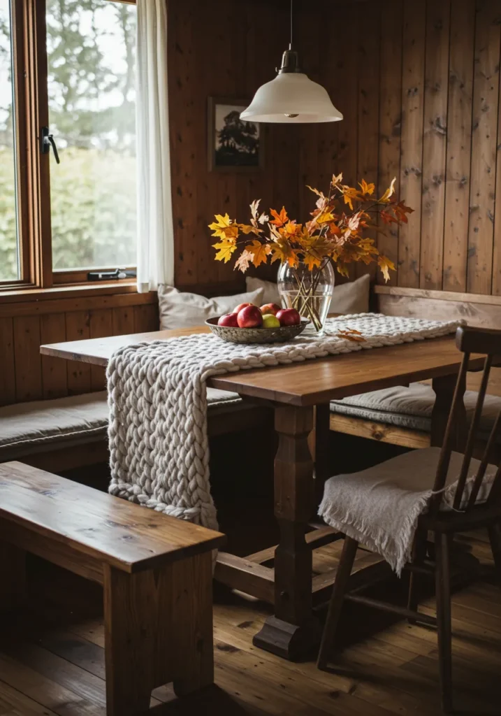 This wooden table is topped with a chunky knit runner, a clear vase of golden leaves, and a bowl of fresh apples. Surrounded by wood-paneled walls and bench seating, it radiates cabin coziness.