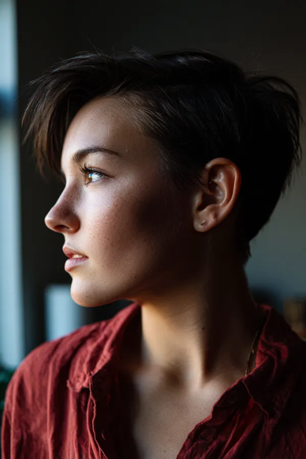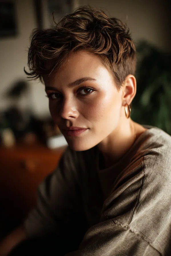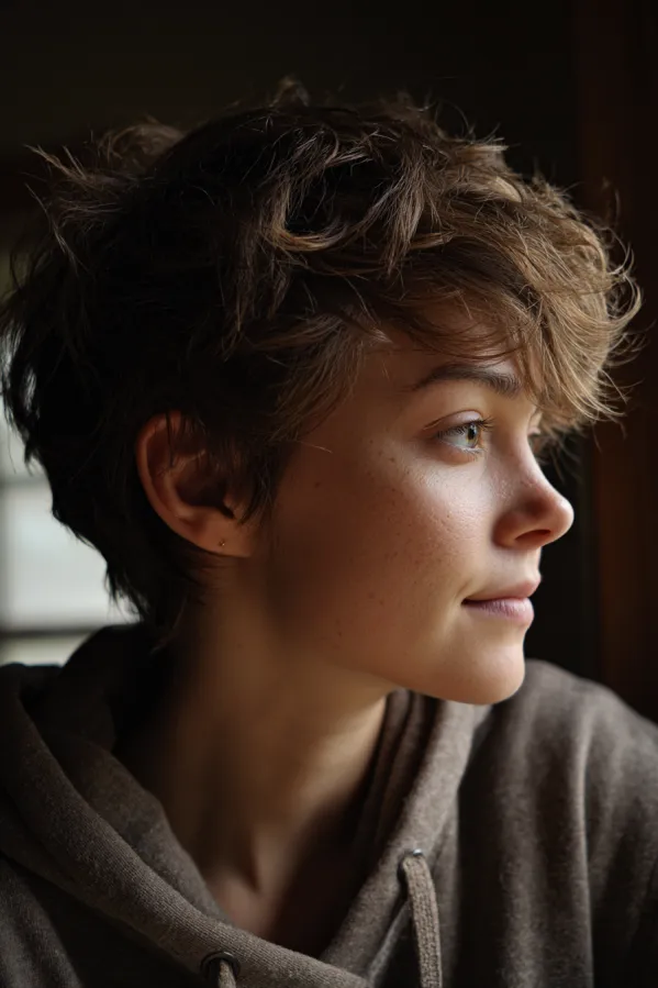 This tomboy hairstyle features a short pixie cut with soft, choppy layers that create natural volume and movement on top. The sides are neatly tapered while the crown stays fuller with a slightly tousled finish, and the warm brunette tone adds depth and dimension.