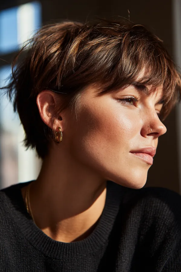 This tomboy hairstyle features a short pixie cut with soft feathered layers that create natural movement and light texture. The length is slightly longer around the crown and fringe, giving it a gentle, airy shape, while the warm brunette tones add depth and a subtle glow.