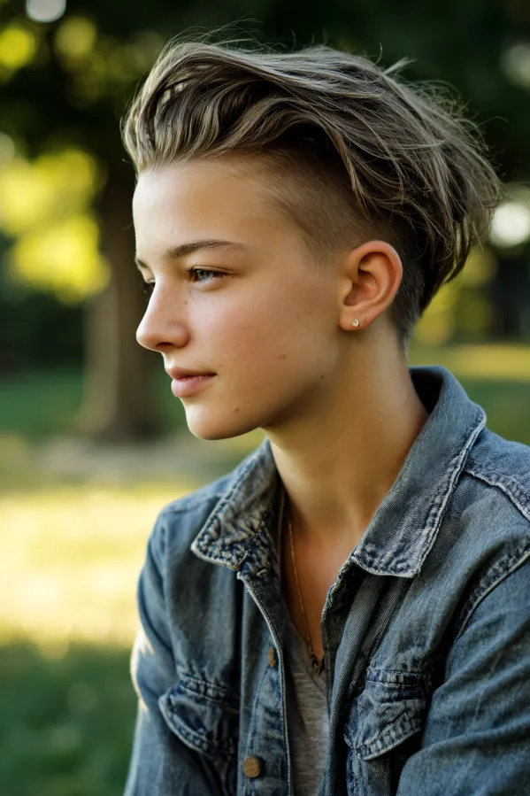 This tomboy hairstyle features a clean undercut with closely shaved sides and a longer top full of airy texture and volume. The top is styled upward and slightly back, creating height and movement, while the soft ash brown tones add a natural, modern finish.