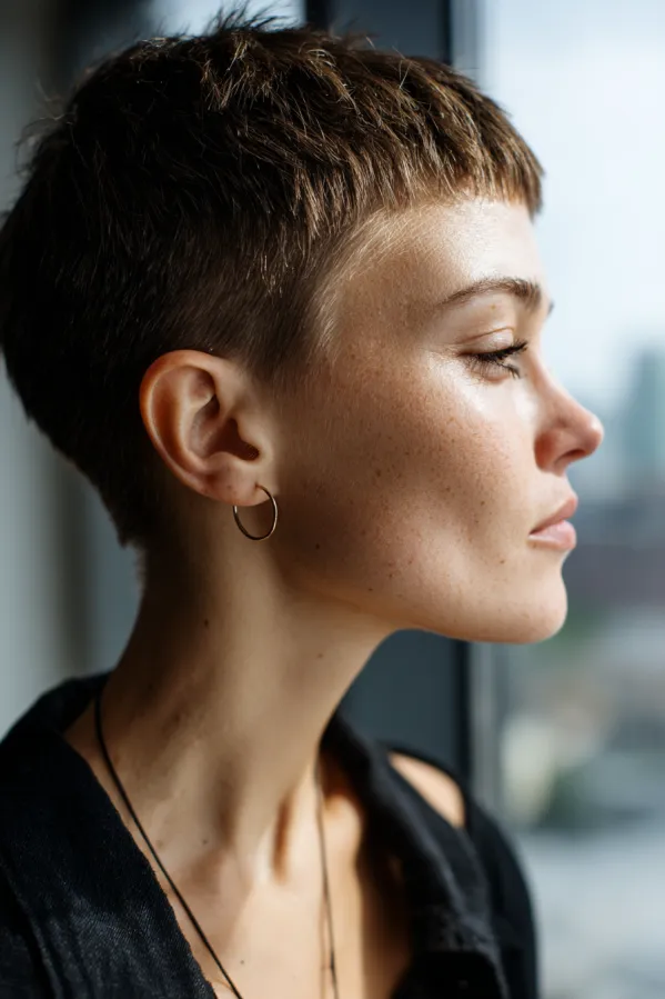 This tomboy hairstyle features a very short crop with a clean tapered fade along the sides and back. The top is kept slightly longer with a soft, even texture, and the short fringe sits neatly across the forehead for a crisp, modern finish. The natural brown tone keeps the look simple and sharp.