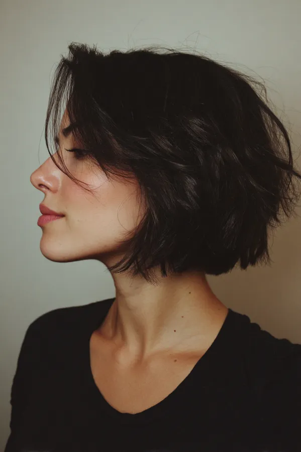 This tomboy hairstyle features a short bob with soft layers and a slightly tousled texture that adds natural movement. The length sits just around the jawline with subtle shaping at the ends, while the deep brunette color keeps the look rich and understated.