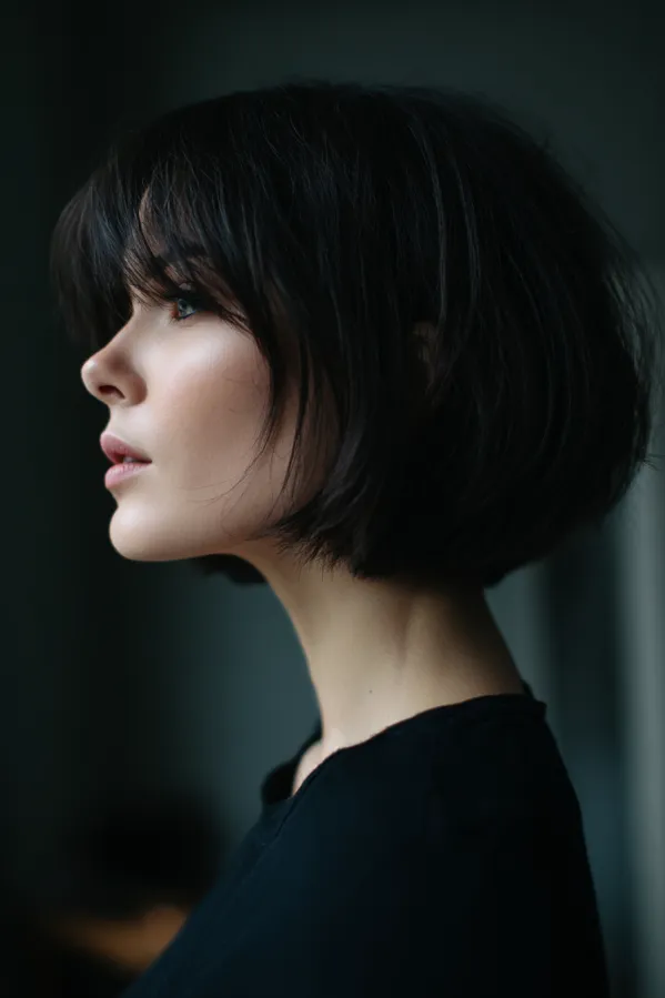 This tomboy hairstyle features a chin length bob with soft layers and a light fringe that frames the face. The texture is smooth with a gentle inward curve at the ends, and the deep dark tone gives it a sleek and refined finish.