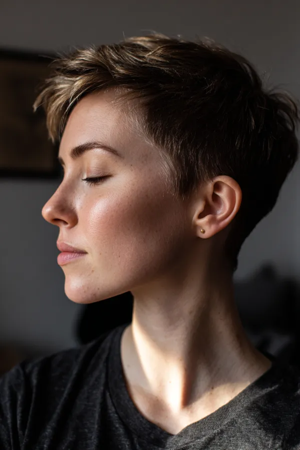 This tomboy hairstyle features a short tapered pixie with neatly trimmed sides and a slightly longer top. The texture is soft and lightly tousled, with subtle natural highlights that add depth and dimension to the warm brown base.