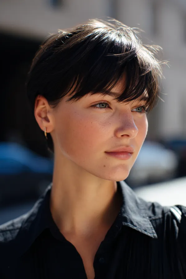 This tomboy hairstyle features a short, clean crop with soft layers and a light fringe that rests gently across the forehead. The texture is smooth with a slight natural lift, and the deep dark tone gives it a sleek and refined finish.