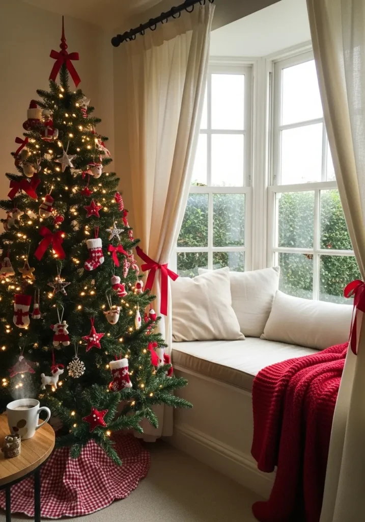 This cozy corner feels straight out of a timeless holiday postcard. A lush green Christmas tree sparkles with warm white lights, dressed in the sweetest red-and-white ornaments—tiny stockings, stars, and little felt reindeer that look lovingly handmade. The tree skirt in red gingham adds that nostalgic country touch, perfectly matching the red bows tied neatly around the cream curtains. The soft window seat beside it, layered with plush white cushions and a chunky red knit throw, creates the perfect little nook for sipping cocoa and watching the snowfall outside.