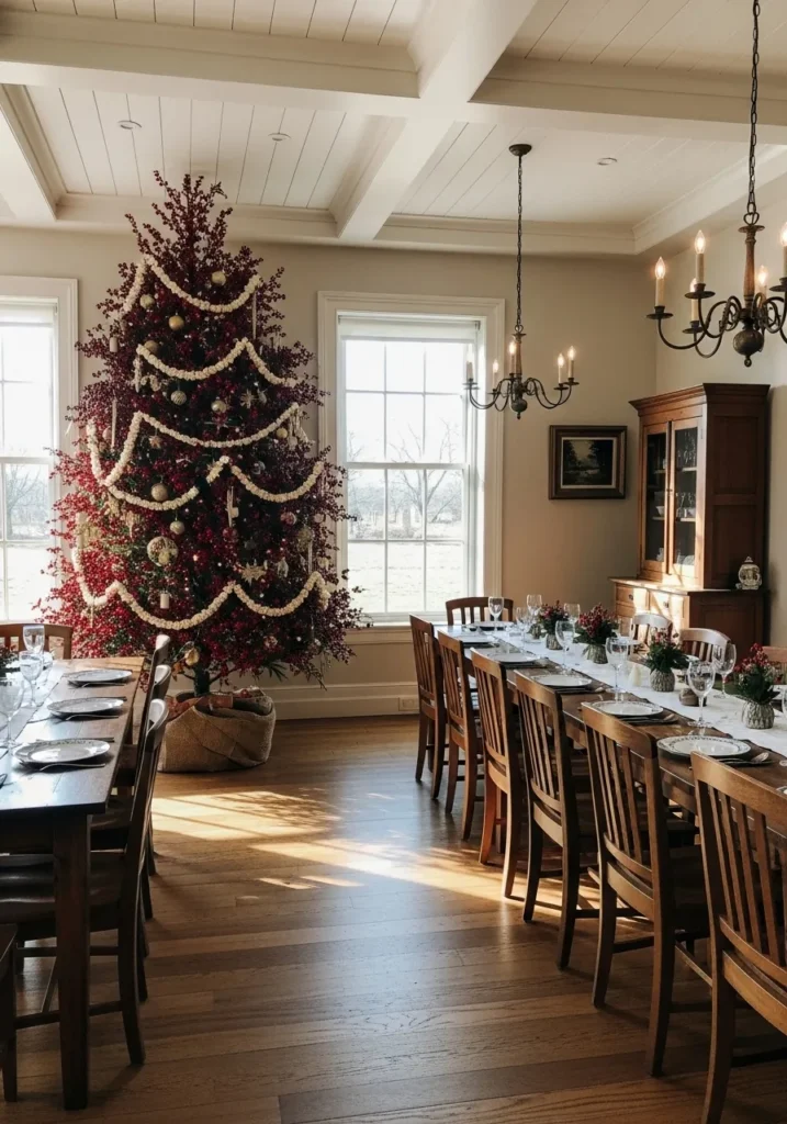 This beautiful dining room captures everything I love about traditional holiday style. The space feels warm and timeless with its wooden floors, long farmhouse tables, and classic spindle-back chairs. The tall Christmas tree dressed in deep red berries and draped with old-fashioned popcorn garlands steals the show, perfectly framed by the bright winter light streaming through those big windows. The black iron chandeliers and rustic china cabinet add a touch of old-world charm that makes the entire setting feel welcoming and festive.