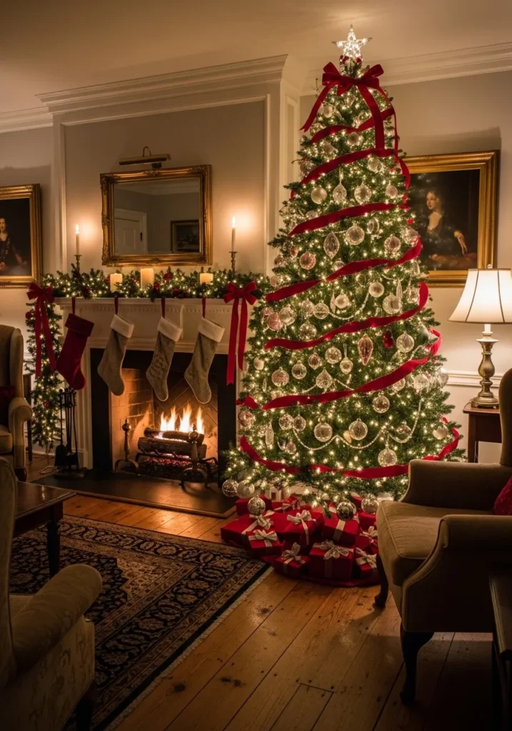 I absolutely love how this design captures that perfect blend of tradition and comfort. It’s the kind of room that makes you want to curl up with a blanket, sip cocoa, and just watch the lights twinkle. The red ribbons tie everything together so gracefully, and honestly, I think this might be one of those looks that never needs updating—it’s elegant, warm, and just so wonderfully nostalgic.