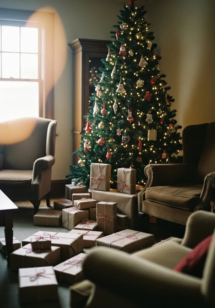 This classic living room captures everything we adore about a traditional Christmas setting. A beautifully lit tree stands proudly near the window, draped in nostalgic ornaments of red, white, and gold. The soft glow from the fairy lights reflects gently off the vintage baubles, creating that heartwarming sparkle we all wait for each December. The neutral-toned armchairs, wooden furniture, and stacks of neatly wrapped gifts in simple brown paper tie everything together into a perfectly timeless scene.