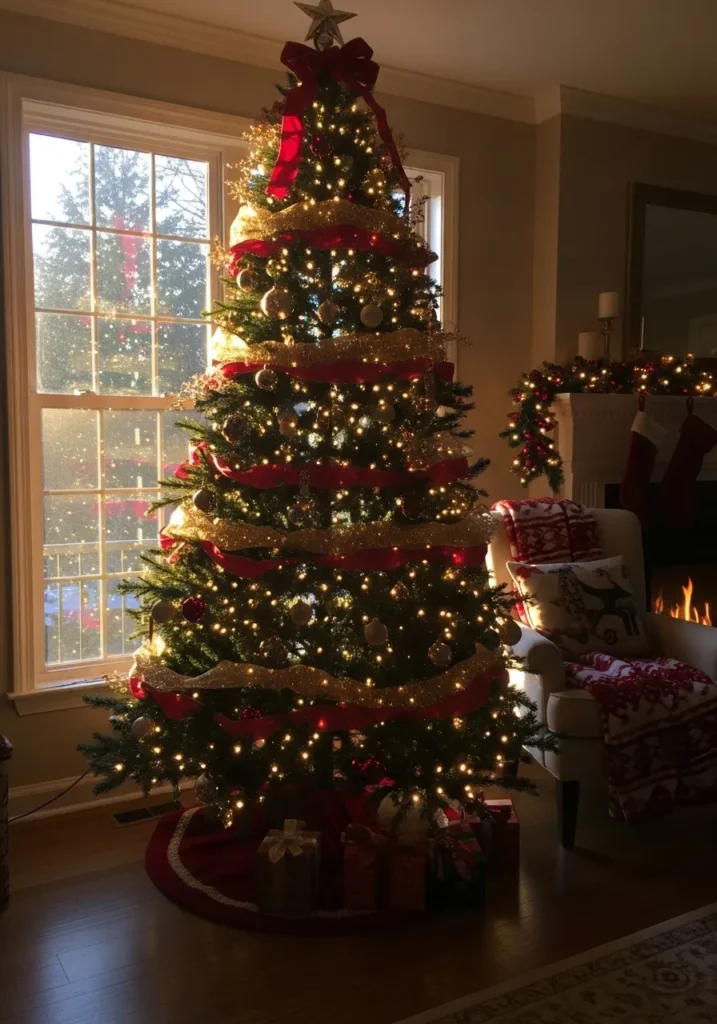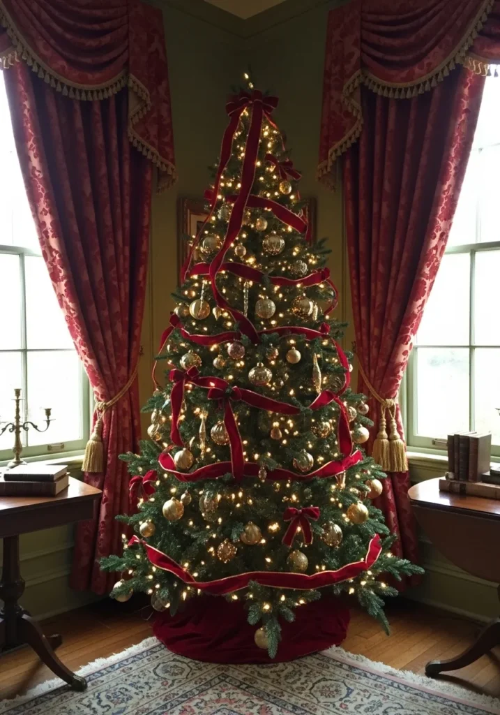 This classic parlor setting is the picture of timeless Christmas charm. The tall evergreen stands proudly between two grand windows, wrapped in glowing golden lights that reflect beautifully off shimmering glass ornaments. Deep red velvet ribbons spiral gracefully from top to bottom, perfectly echoing the lush red drapery trimmed with gold tassels. Every detail feels luxurious yet warm, creating that nostalgic “old-world Christmas” feeling you only get in homes that celebrate tradition with heart and style.