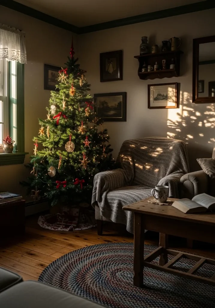 This space captures that timeless countryside warmth that always feels like home. The Christmas tree stands proudly by the window, dressed with straw ornaments and dainty red bows that give off a nostalgic, handcrafted feel. The golden afternoon light pouring through the lace curtain creates soft shadows on the walls, making everything feel wonderfully calm and familiar. The braided rug, the wooden floors, and the snug armchair draped with a knitted blanket all whisper of quiet winter afternoons and the simple joy of slowing down.