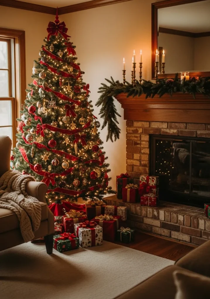 This cozy living room looks like it was made for December evenings spent wrapped in a blanket with a mug of hot cocoa. A tall Christmas tree sparkles beside the fireplace, dressed in timeless red ribbons, golden ornaments, and delicate silver baubles. The brick hearth is softly lit by flickering candles, and a garland of evergreens drapes gracefully across the mantel, giving off that rich pine scent everyone loves. Neatly wrapped presents in shades of red and green fill the corner, while the gentle glow from the tree lights reflects off the nearby window, casting a warm shimmer across the room.