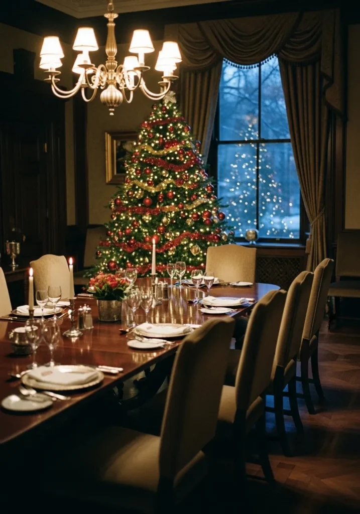 This beautiful dining room feels like a scene straight from a timeless holiday movie. The space features rich wooden tones, soft candlelight, and a grand Christmas tree standing proudly by the window, dressed in red and gold ornaments that shimmer against the twinkling lights. The chandelier’s warm glow enhances the cozy yet sophisticated atmosphere, while the neatly set dining table promises an evening of laughter, comfort, and classic holiday charm. Every element, from the polished silverware to the lush garland reflections in the glass, radiates tradition and grace.