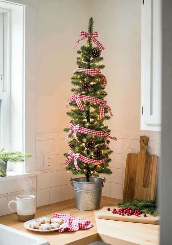This tiny Christmas tree proves that even the smallest nook can sparkle with holiday cheer. Set in a bright kitchen corner, the tree sits neatly in a galvanized bucket, dressed with warm white fairy lights, pinecones, and charming red gingham ribbons tied in bows. The natural wood countertop, white tile backsplash, and touches of evergreen branches create that perfectly homey farmhouse look. It’s simple, traditional, and effortlessly festive.