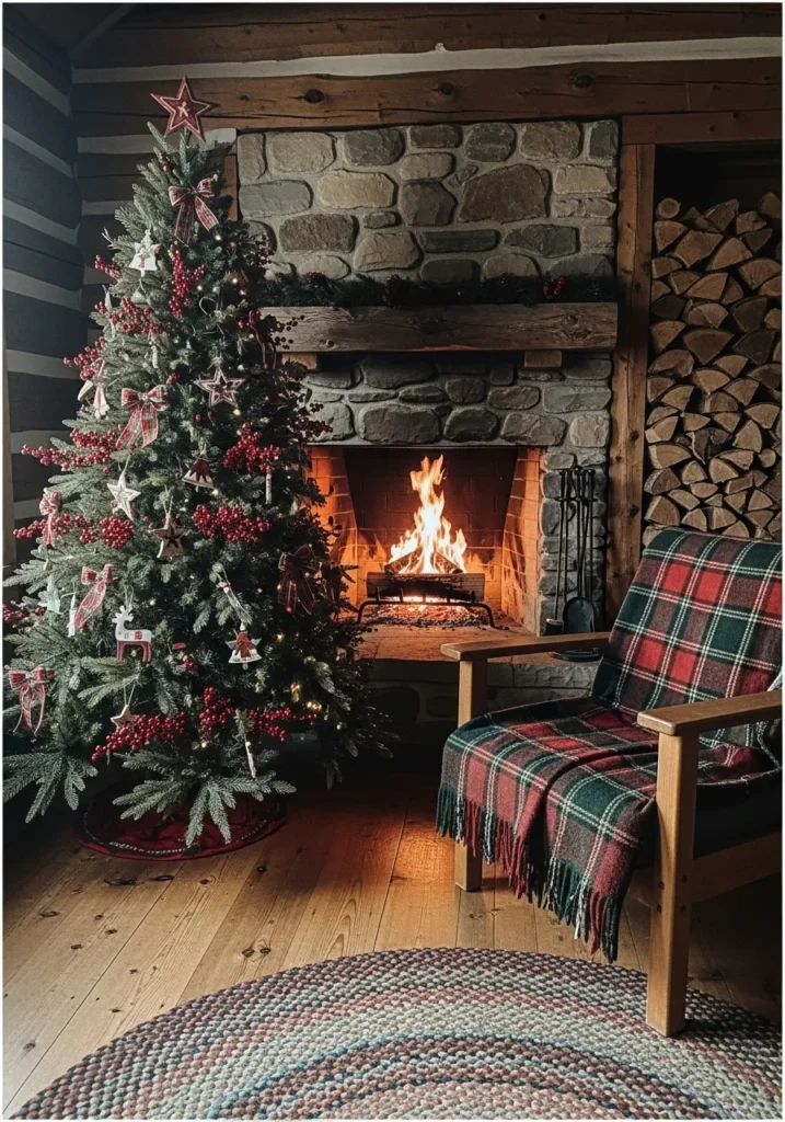 This charming lodge-style living room feels like the perfect Christmas postcard come to life. The rustic stone fireplace sets the mood with its crackling fire, framed by rich wooden beams and a stack of neatly cut firewood ready for the next cozy evening. The Christmas tree glows warmly beside it, dressed in red berries, plaid ribbons, and handmade star ornaments that blend beautifully with the natural textures of the room. A simple woven rug and a plaid throw on the armchair complete the picture, making the whole space feel delightfully homey and timeless.