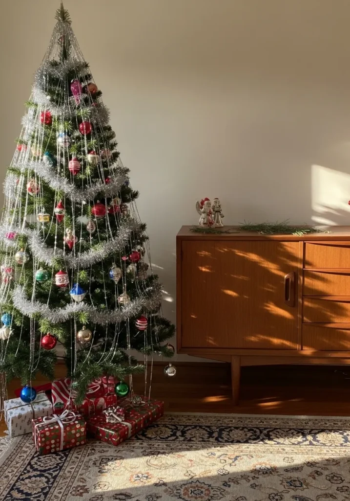 This cozy corner perfectly blends vintage charm with timeless Christmas warmth. The mid-century wooden sideboard brings that sleek, simple beauty of the 60s, while the Christmas tree beside it steals the show with shimmering tinsel garlands and classic glass ornaments in red, silver, and blue. Soft afternoon sunlight spills across the patterned rug, highlighting the wrapped gifts under the tree and giving the whole room that nostalgic, golden glow that feels right out of an old Christmas movie.