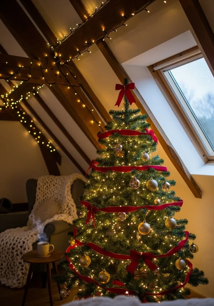 This cozy attic nook feels like a hidden holiday hideaway. The warm glow of fairy lights dances across rustic wooden beams, while a perfectly shaped Christmas tree takes center stage beneath the slanted ceiling. Its simple yet elegant decor of golden baubles, twinkling lights, and red velvet ribbons creates that timeless Christmas feeling we all secretly crave. A plush armchair with a chunky knit blanket waits nearby, and the steaming cup of cocoa makes the whole space look like a moment paused in pure comfort.