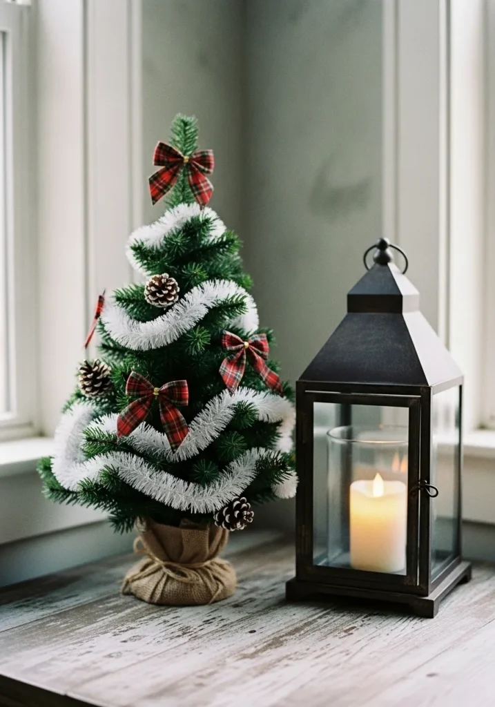 This little corner feels like pure Christmas coziness. A petite evergreen sits by the window, its branches wrapped in fluffy white garland and dotted with rustic pinecones and red plaid bows. The tree rests in a natural wood pot that adds a lovely handmade charm, while the nearby black lantern with a flickering candle gives the whole space a warm, nostalgic glow. The natural light from the window makes the green needles sparkle softly, giving the scene that quiet, magical stillness only winter mornings seem to have.