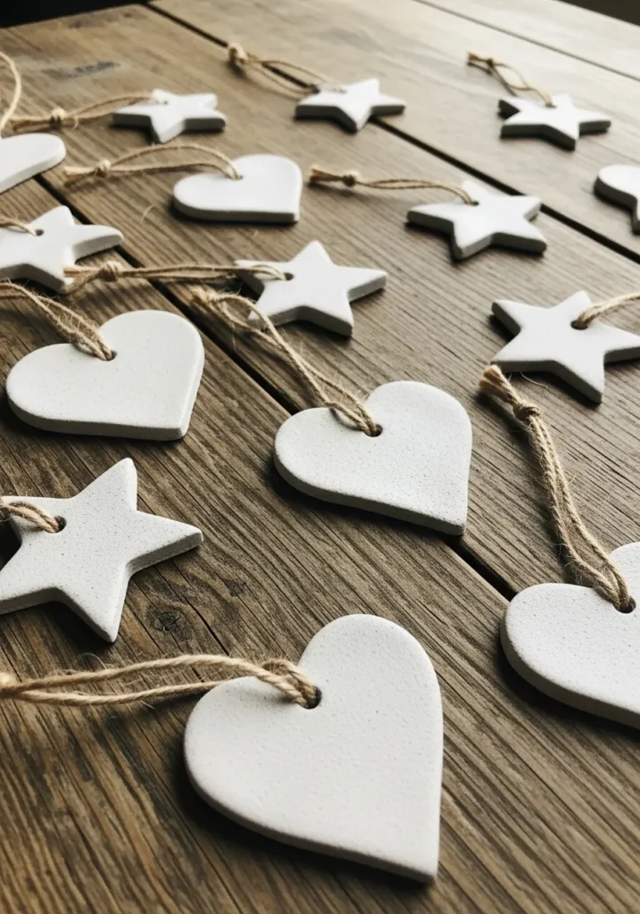 Simple clay ornaments shaped like hearts and stars bring a lovely handcrafted touch. Their clean white finish and natural twine loops make them look effortlessly chic. Spread out on rustic wood, they blend modern minimalism with a warm, natural feel.