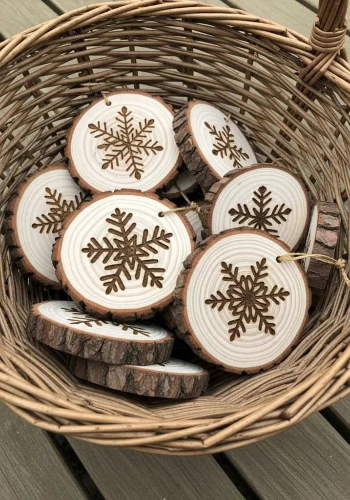 These wooden slice ornaments feature intricate snowflake carvings that show off the beauty of natural wood grain. The bark edges and twine ties make them feel earthy and genuine, perfect for anyone who loves a rustic touch.