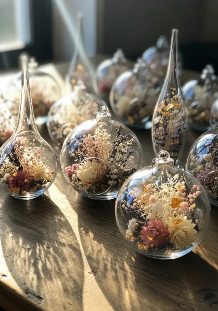Delicate glass ornaments filled with dried flowers and gold flakes look like tiny preserved gardens. Each one captures a bit of natural beauty, catching sunlight in the most delicate way. They feel light, airy, and completely one-of-a-kind.