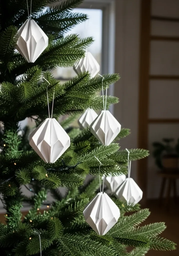 Crisp white origami ornaments add sculptural beauty to this green tree. Their clean geometric folds catch the light in a subtle, modern way. The simple white and green palette keeps everything feeling fresh and balanced.
