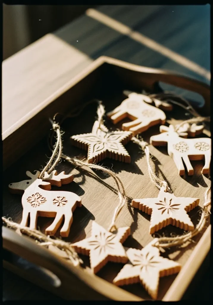 A tray of wooden reindeer and star ornaments brings a classic, homemade charm. The light wood tones and jute strings make them feel cozy and natural, with just the right amount of detail to keep them interesting.