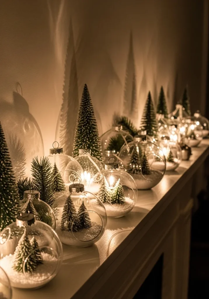 Clear glass globes filled with tiny trees and faux snow create a magical snowy forest effect. Arranged across a mantel with twinkle lights, they reflect a soft golden glow that feels cozy and enchanting.