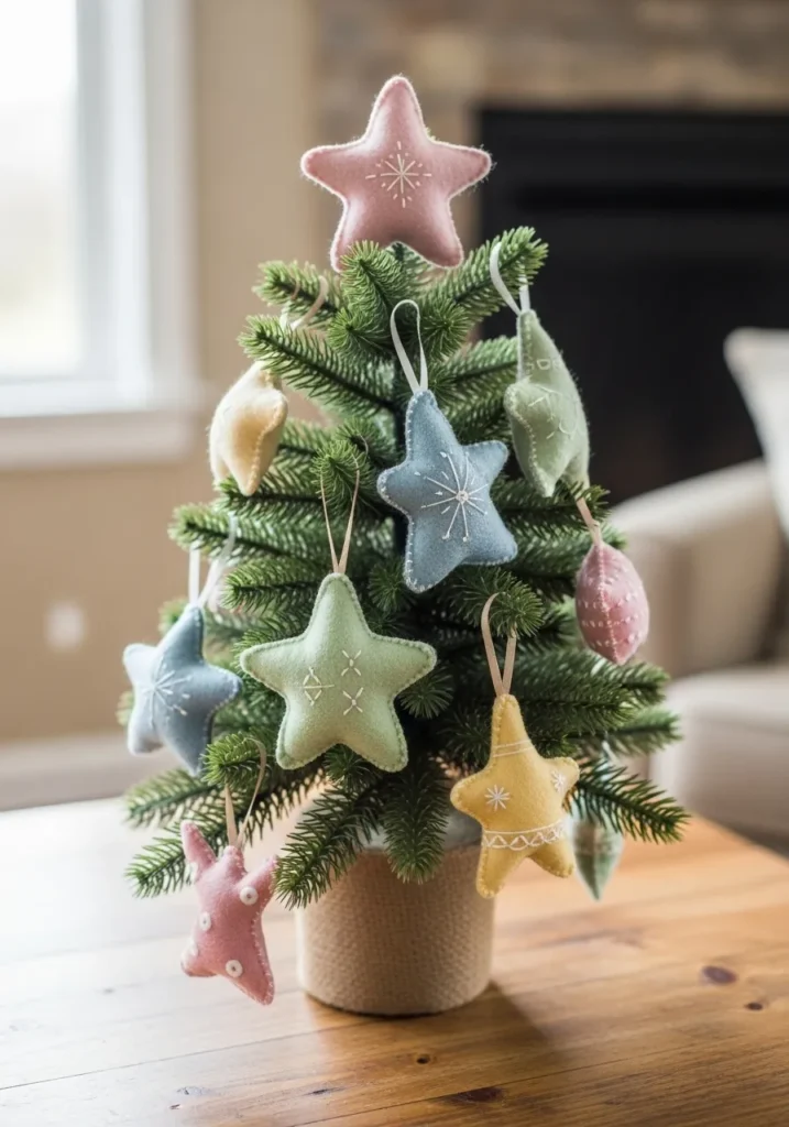 Soft pastel stars in shades of pink, blue, green, and yellow bring a playful touch to this little Christmas tree. Each ornament has delicate embroidered details that make it feel homemade and full of heart. The simple setup on a wooden table gives off such a warm, inviting vibe.