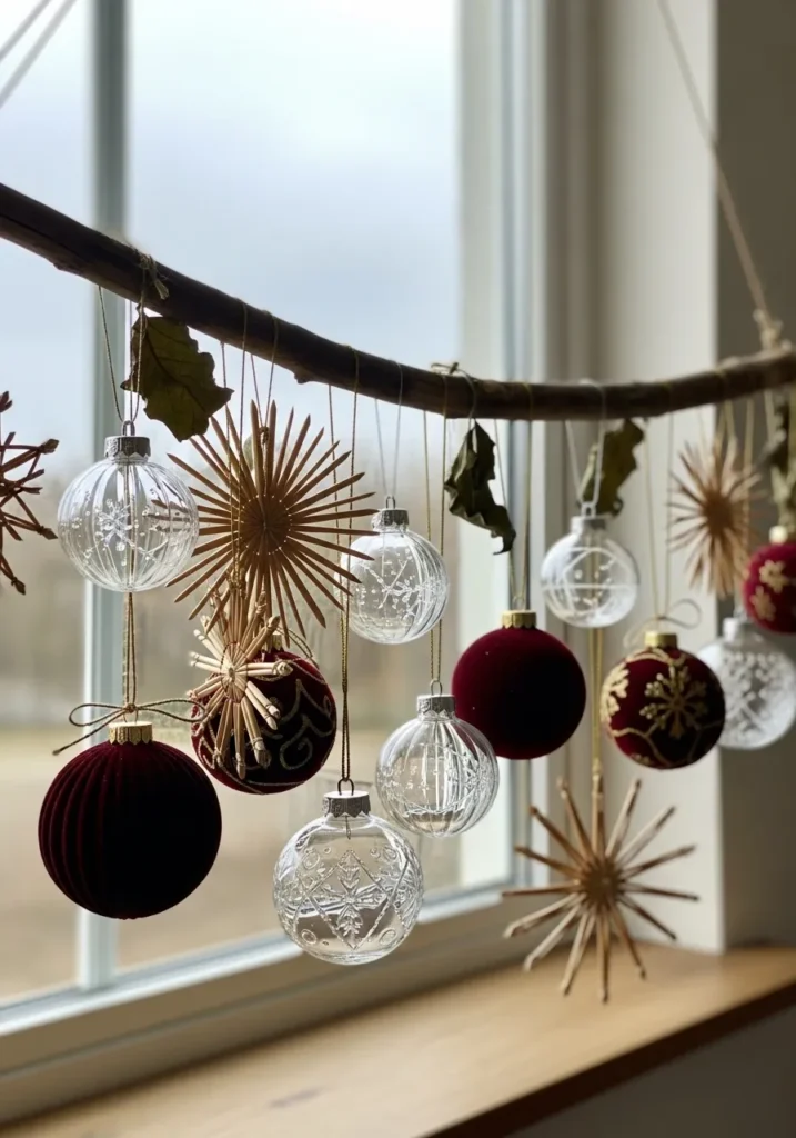 A mix of deep burgundy velvet, etched glass, and straw ornaments hang beautifully from a rustic branch. The natural textures and gold accents create such a charming balance between cozy and chic. It’s a modern twist on a vintage-inspired look that feels effortlessly stylish.