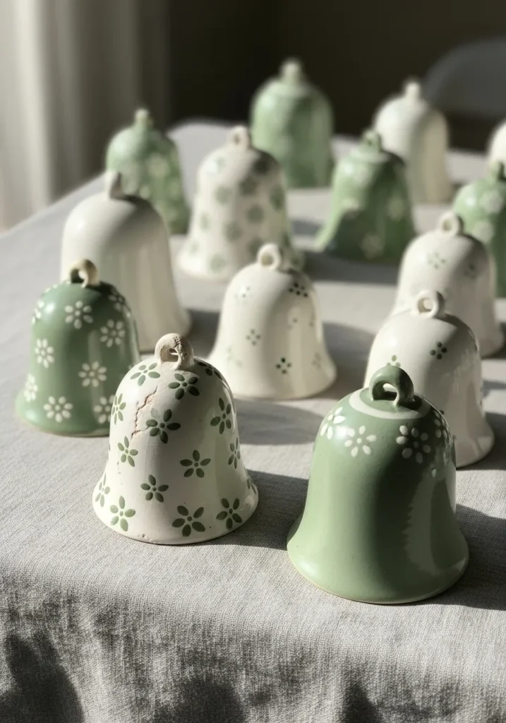 Soft green and cream ceramic bells decorated with tiny floral patterns look sweetly nostalgic. Their matte glaze and subtle imperfections make them feel genuinely handmade. Set against simple linen, they radiate quiet charm and craftsmanship.