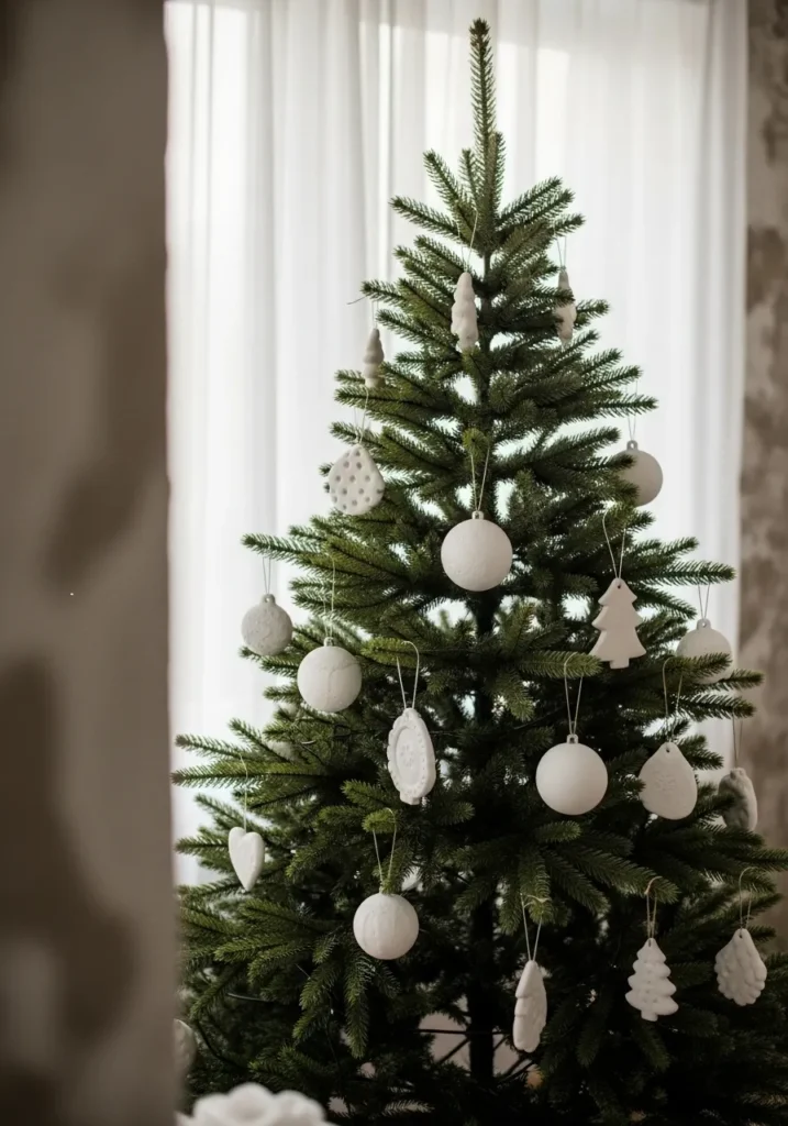 This minimalist tree keeps things serene with only white ornaments in various shapes like hearts, pinecones, and trees. The monochrome palette highlights the texture and craftsmanship of each piece, while the greenery provides the perfect contrast.