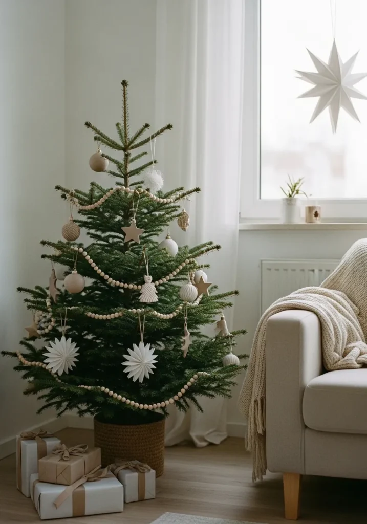 This little tree proves that simple really can be stunning. Adorned with neutral-toned ornaments, paper stars, and wooden beads, it feels fresh yet timeless. The light filtering through the window adds a soft glow that makes every detail pop.
