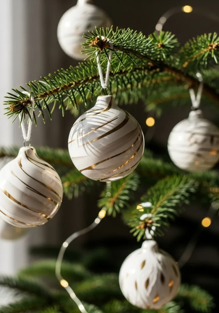 These glossy ornaments mix soft white with fine gold lines that wrap gracefully around each bauble. The light catches them just right, creating a warm shimmer that feels both elegant and understated. They look stunning against fresh green pine needles and soft twinkle lights.