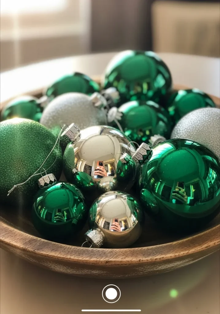Glossy green and silver ornaments fill a wooden bowl for a look that’s both bold and classic. The shine catches the light perfectly, giving the whole display a luxurious holiday glow. It’s proof that sometimes the simplest ideas are the most eye-catching.