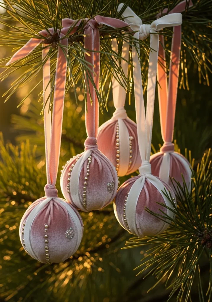 Soft blush velvet ornaments tied with ribbons in cream and pink bring instant romance to the tree. The fabric’s texture and subtle beaded details catch the sunlight in the most delicate way. It feels refined yet whimsical at the same time.