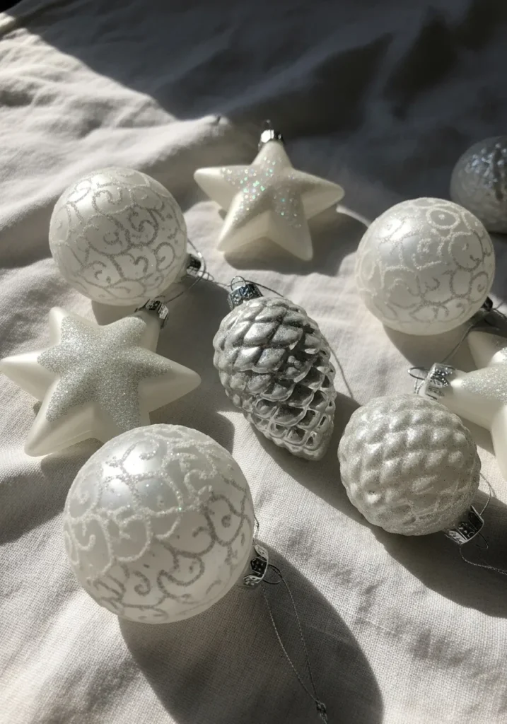 A mix of white and silver ornaments, from glittery stars to pinecone textures, create a wintry sparkle that feels straight out of a snowy fairytale. The light glints softly off each surface, highlighting the delicate swirls and shimmers.