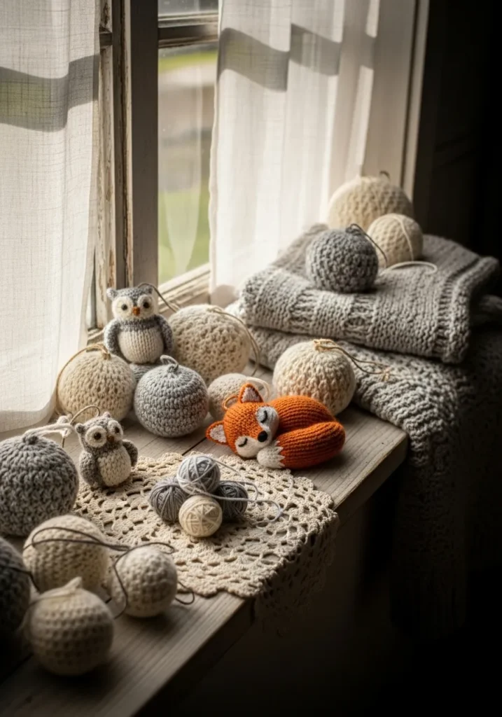 Crocheted ornaments shaped like owls, foxes, and soft round balls rest by the window on layers of cozy knits. The neutral yarn tones and handmade textures give the whole scene a heartwarming cottage feel. It’s rustic comfort at its sweetest.