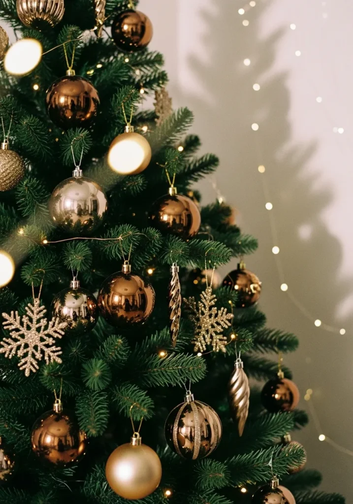 This elegant tree gleams with metallic ornaments in shades of gold and bronze. The mix of shiny and matte finishes, along with sparkling snowflake accents, gives it a balanced, polished feel. Fairy lights softly reflect off every surface, adding that perfect festive glow.