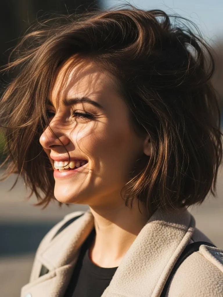 This tousled choppy bob has airy volume through the crown with textured ends that flick softly outward. The rich brunette color makes the movement easy to see especially in natural light.