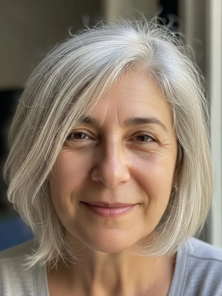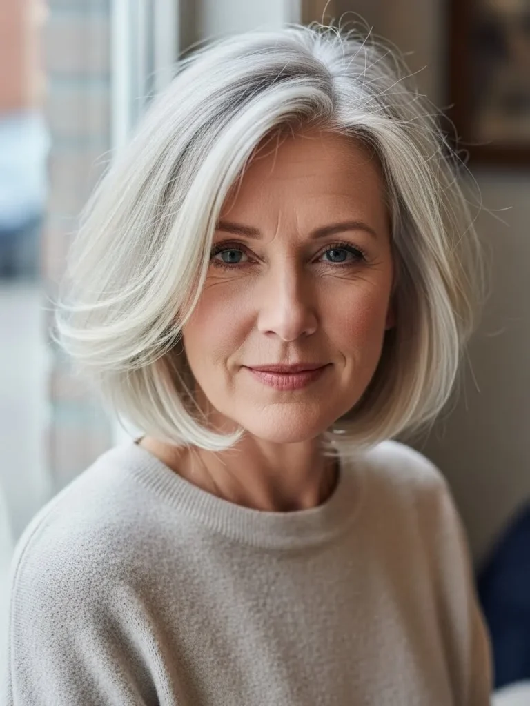 This soft silver bob has airy layers around the crown that lift fine hair while the ends curve gently for a natural full shape. The cool tone adds brightness without overpowering the style.